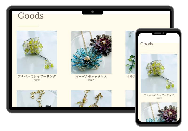 Goods:タイル状に並ぶレイアウトを設定しました。lightboxを使用し、画像をクリックすると拡大するようにしました。