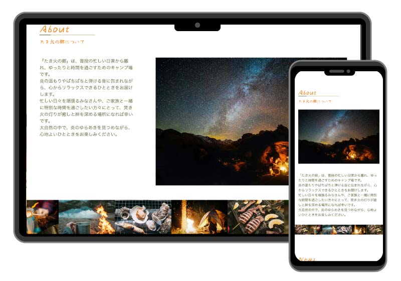 流れる画像:Aboutのセクションに入れました。キャンプをしている時のイメージを膨らませるために設定しました。
