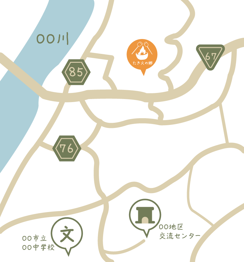 Access:架空の簡易地図を入れました。主要道路、周辺の建物、川、道路名を表記しています。 テーマカラーを使用し、ページの雰囲気に馴染むようにしました。